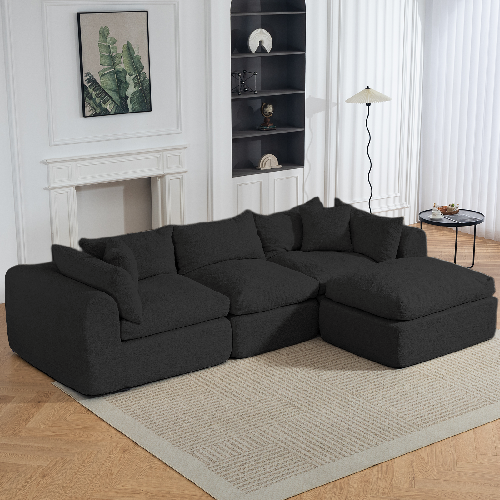 DELMANGO 113 Inch Modular L-Shape Cloud Velvet Sectional Couch, Boneless Convertible Sofa Set with Ottoman, No Assembly, Black