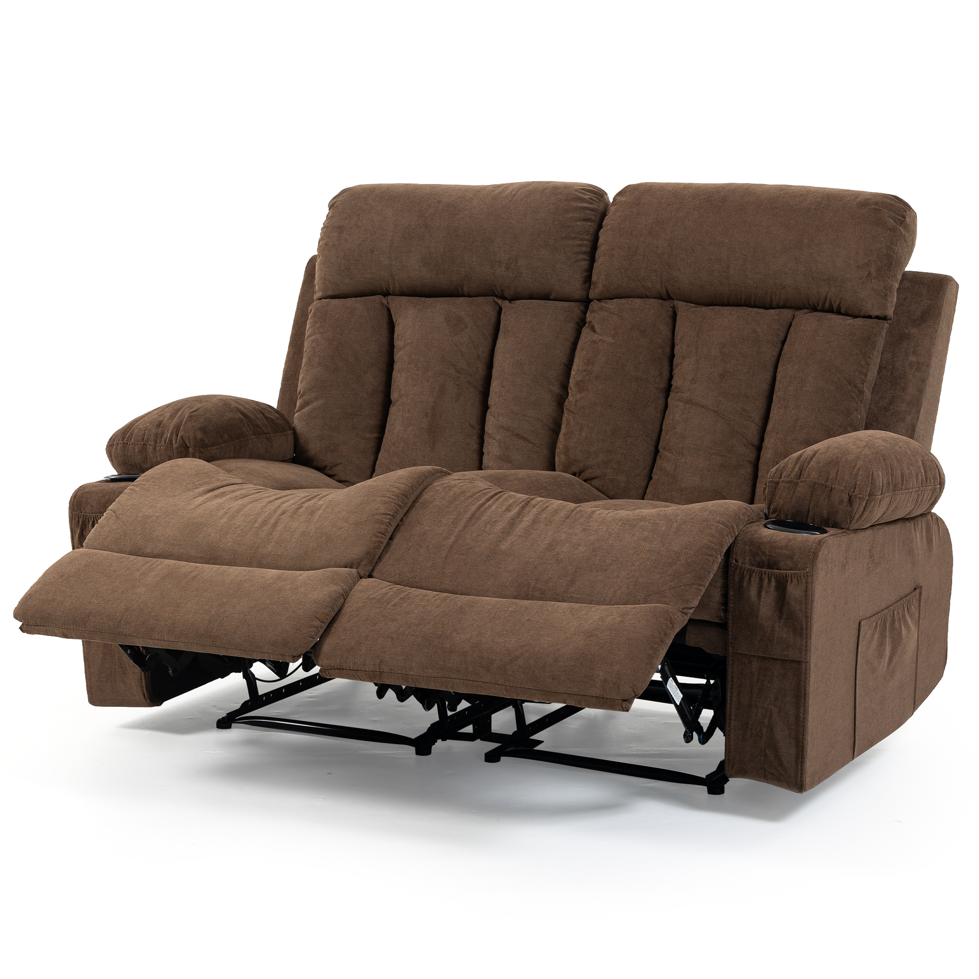 This loveseat reclining sofa with cup holders combines comfort, style, and practicality for living rooms, home theaters, bedrooms, RVs, and small spaces. The 2-seat manual recliner design allows each seat to recline independently up to 160¡ã, and features soft breathable fabric with generously padded cushioning for everyday relaxation. Equipped with built-in footrests, convenient storage pockets, and a sturdy metal frame, this reclining loveseat offers a compact yet comfortable seating solution for any indoor environment.
