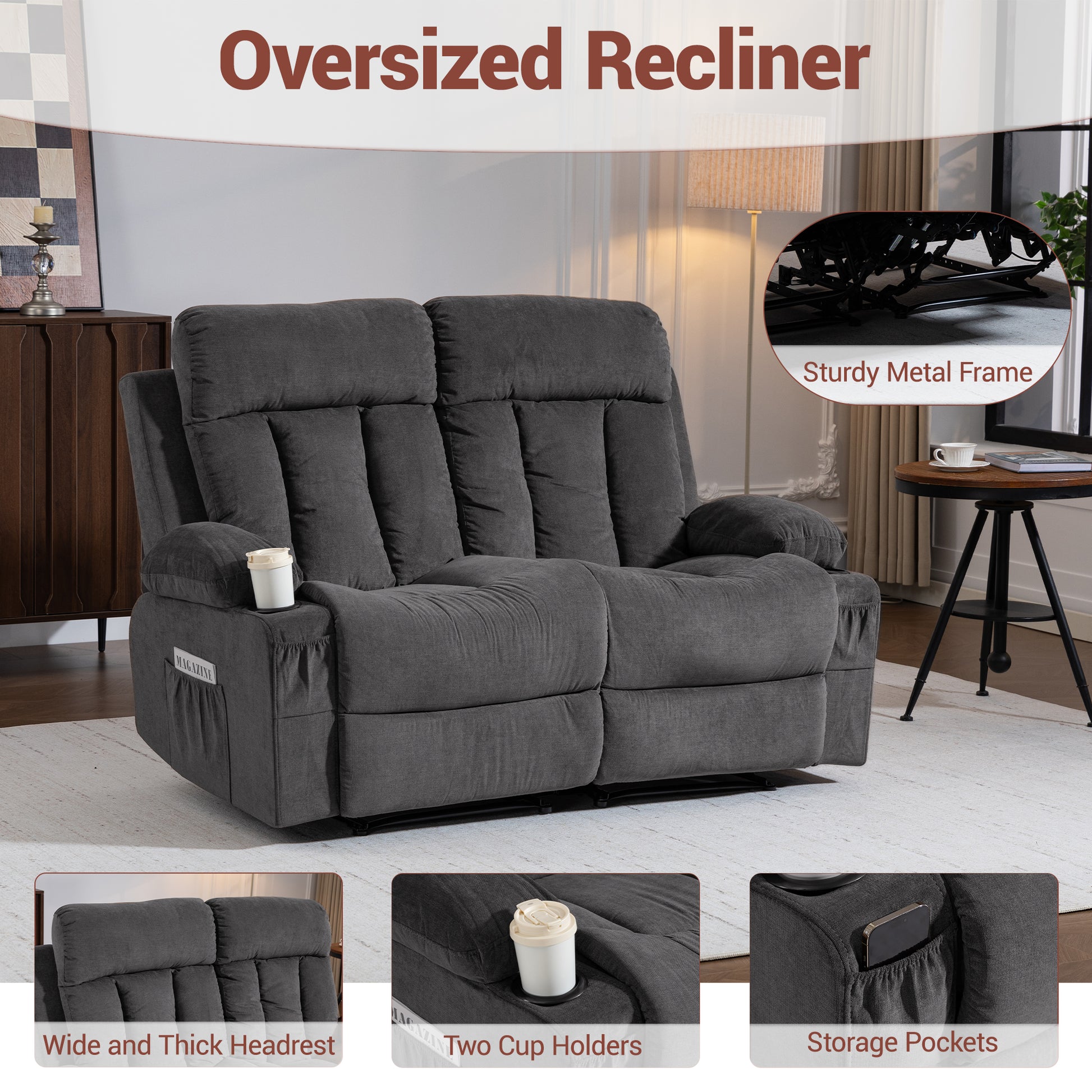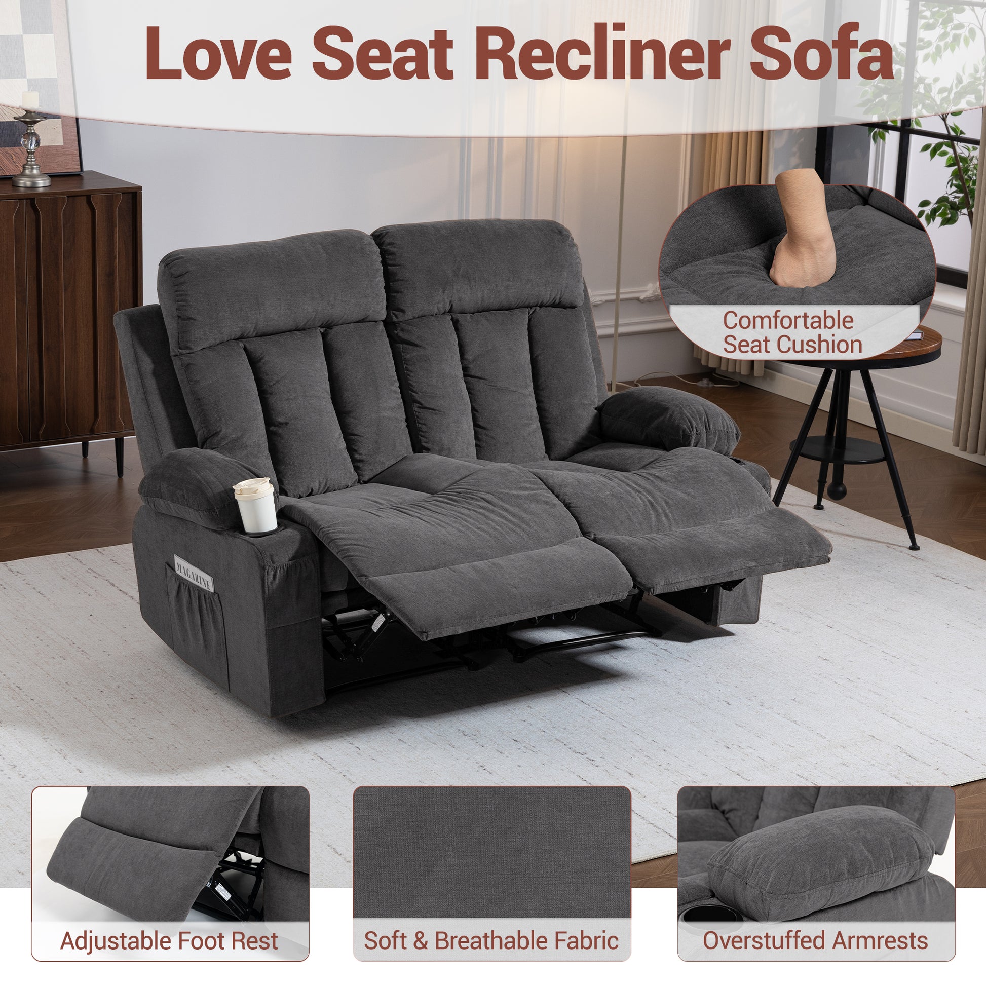 This loveseat reclining sofa with cup holders combines comfort, style, and practicality for living rooms, home theaters, bedrooms, RVs, and small spaces. The 2-seat manual recliner design allows each seat to recline independently up to 160¡ã, and features soft breathable fabric with generously padded cushioning for everyday relaxation. Equipped with built-in footrests, convenient storage pockets, and a sturdy metal frame, this reclining loveseat offers a compact yet comfortable seating solution for any indoor environment.