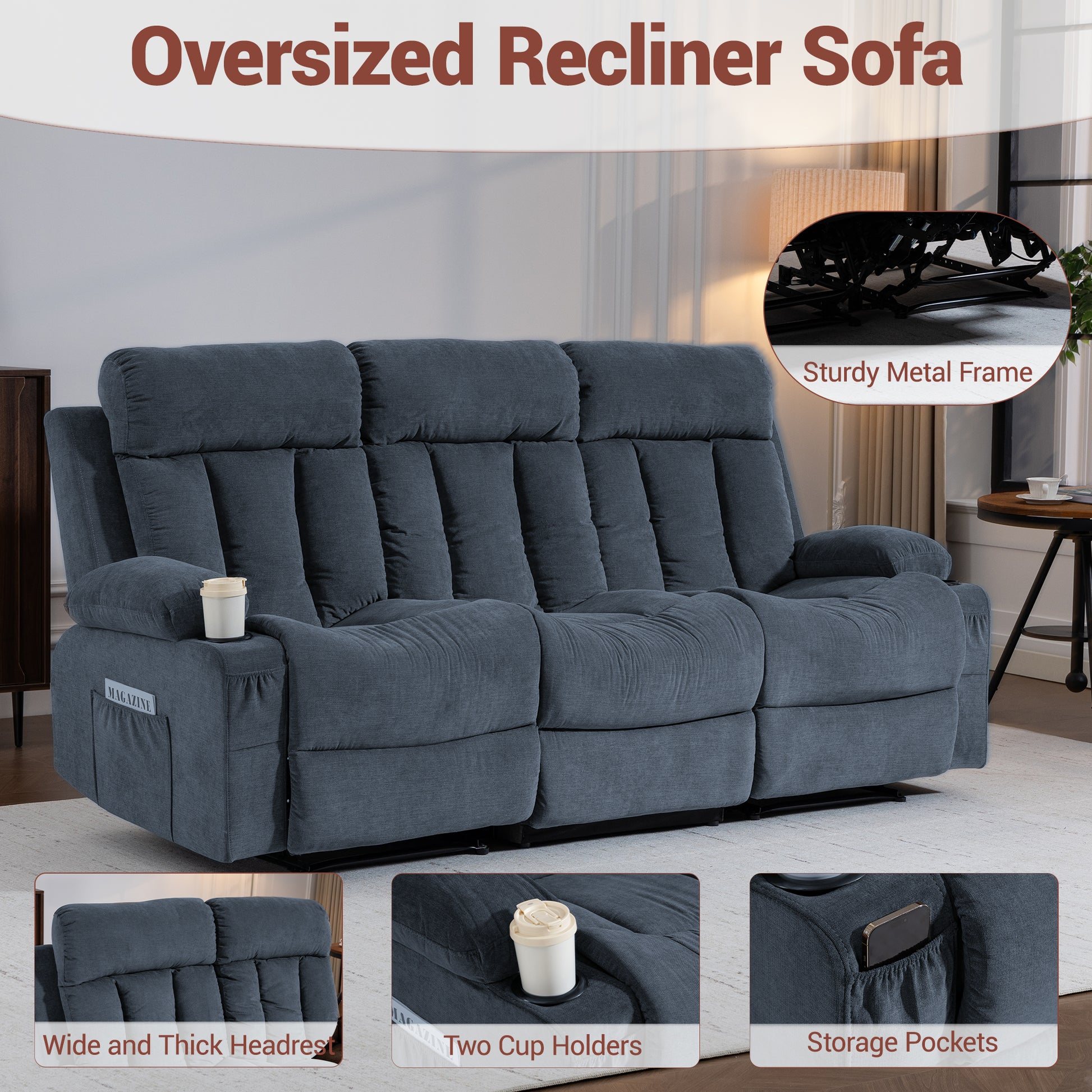 This three-seater sofa with cup holders blends comfort, style, and practicality for living rooms, home theaters, bedrooms, RVs, and small spaces. The manual 3-seat recliner design allows two sides to recline independently up to 160¡ã, featuring soft breathable fabric and generously padded cushioning for everyday relaxation. With integrated footrests, convenient storage pockets, and a sturdy metal frame, this reclining sofa offers a compact and comfortable seating solution for any indoor setting.
