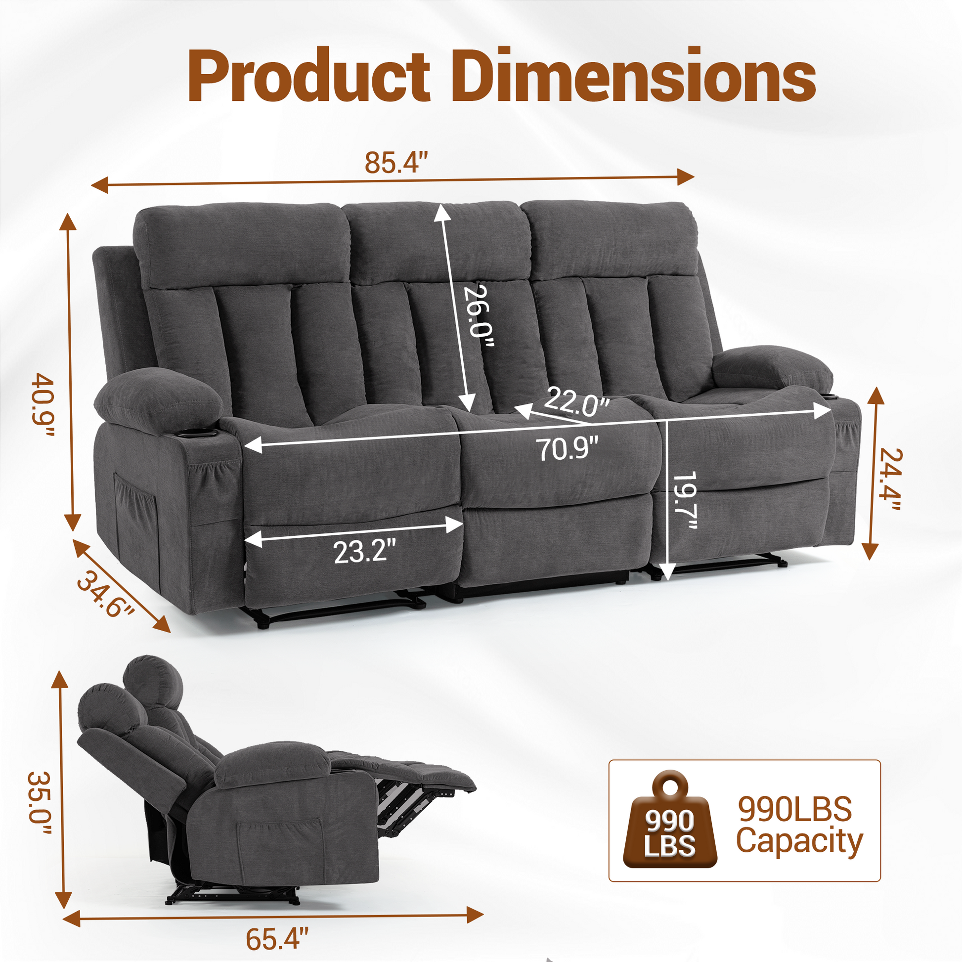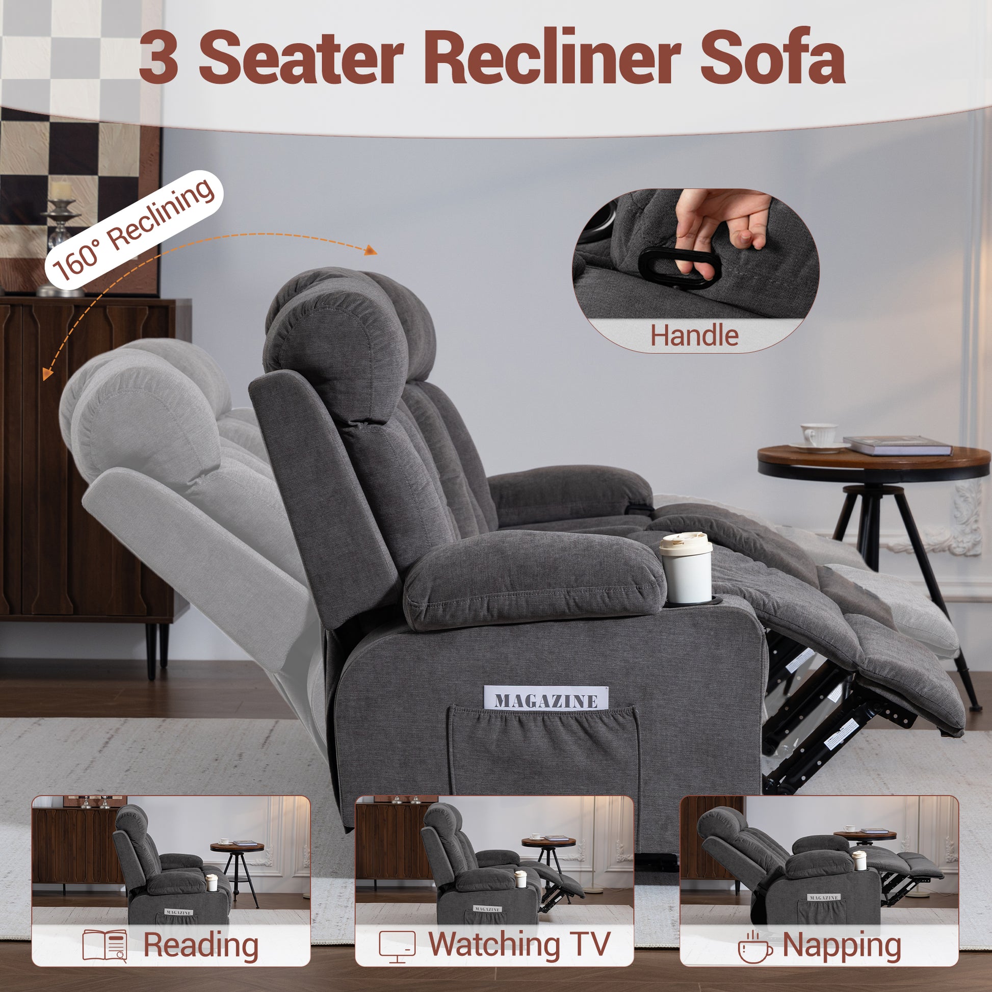 This three-seater sofa with cup holders blends comfort, style, and practicality for living rooms, home theaters, bedrooms, RVs, and small spaces. The manual 3-seat recliner design allows two sides to recline independently up to 160¡ã, featuring soft breathable fabric and generously padded cushioning for everyday relaxation. With integrated footrests, convenient storage pockets, and a sturdy metal frame, this reclining sofa offers a compact and comfortable seating solution for any indoor setting.