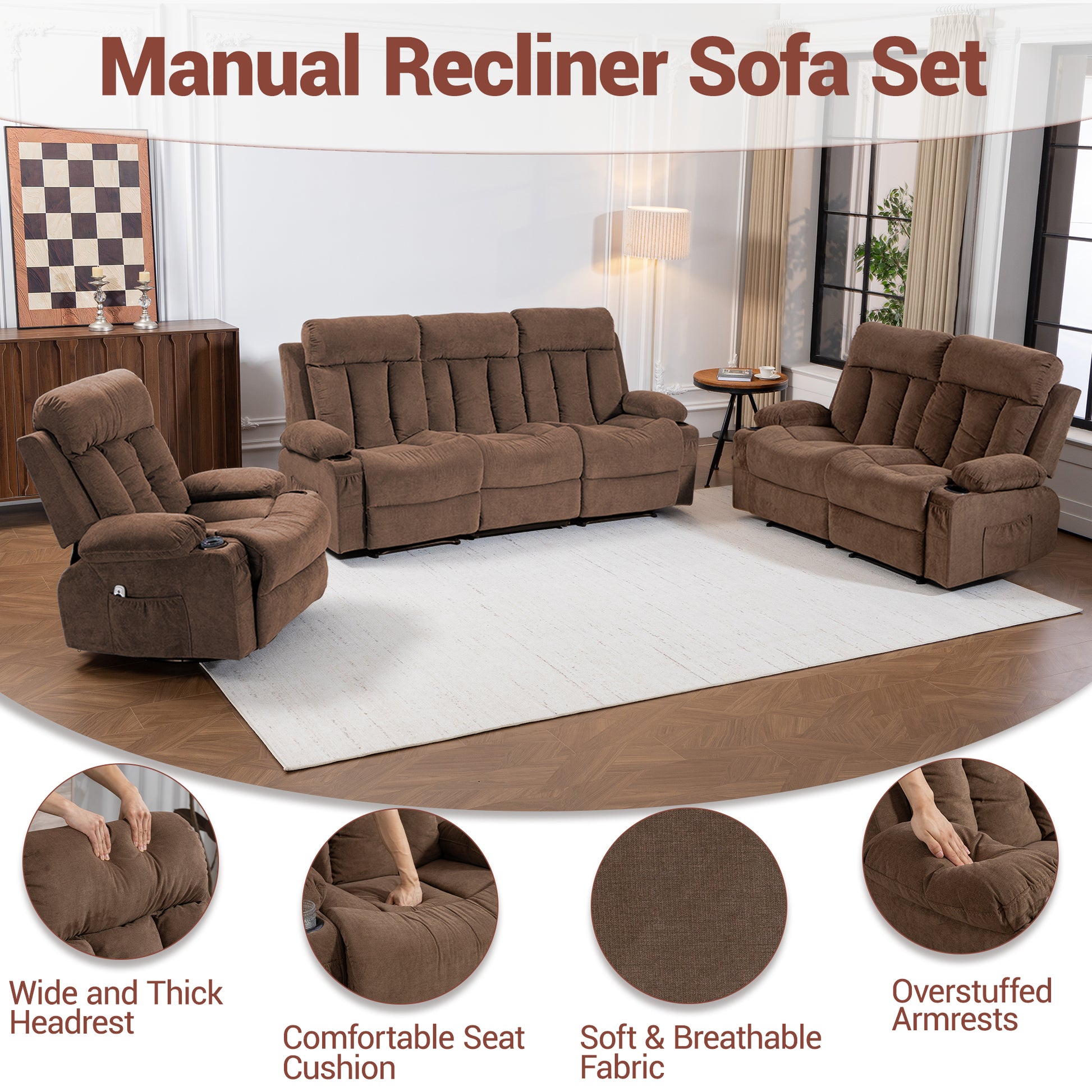 DELMANGO Manual Recliner Sofa Set for Home Theater, Office (Brown, Sofa+Loveseat+Chair)