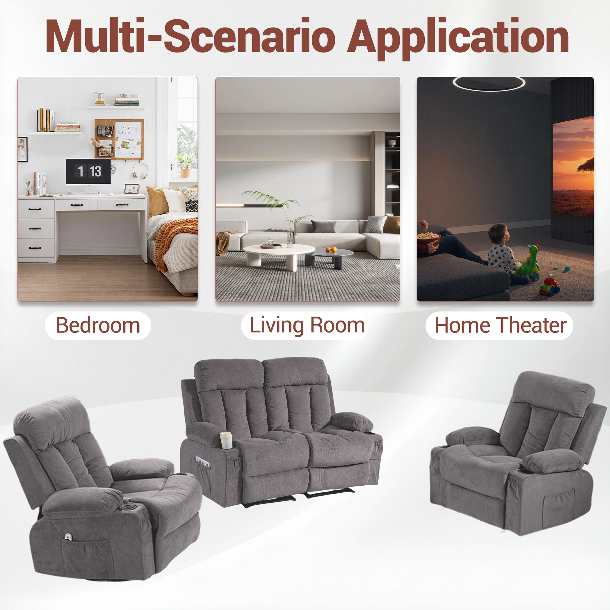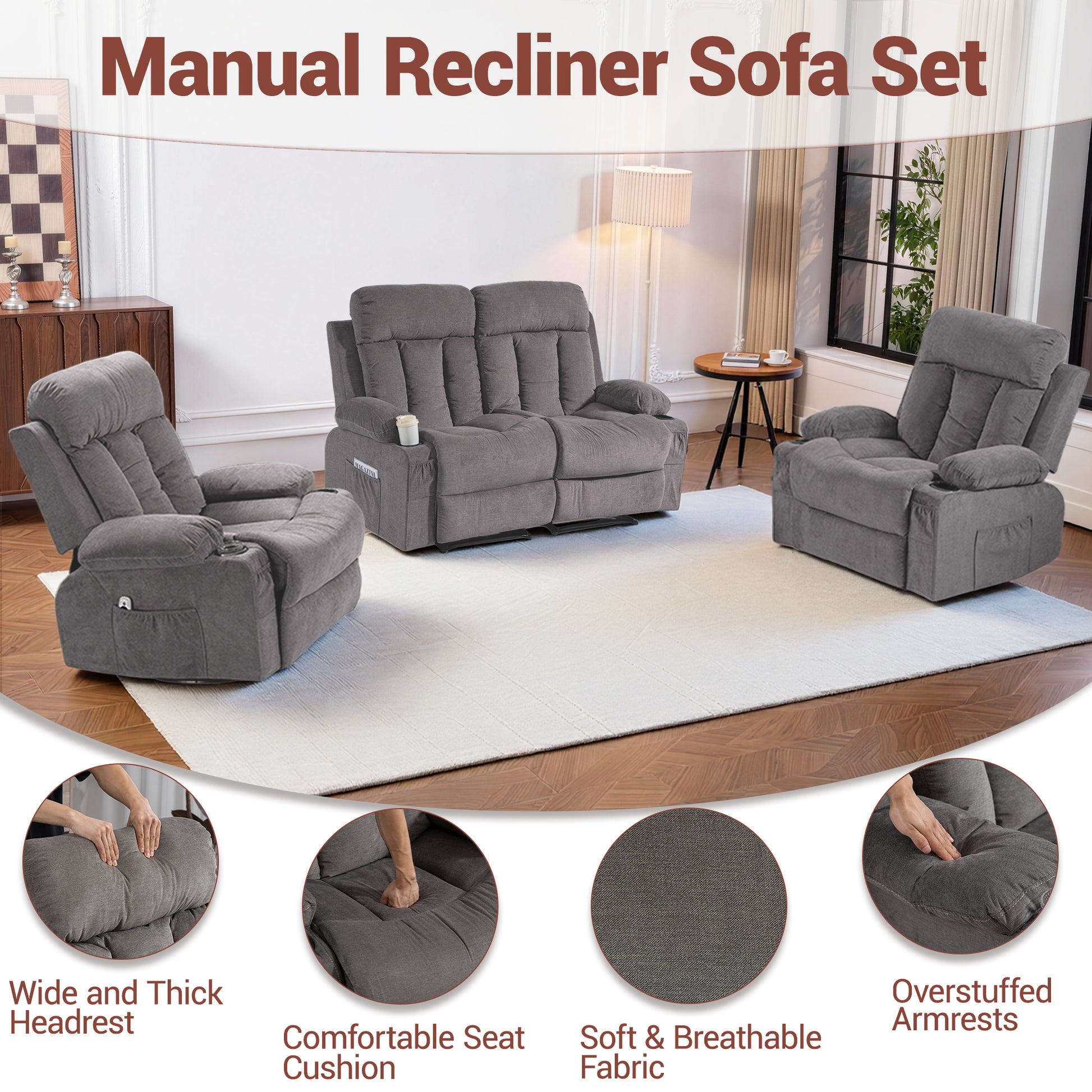 This 3 piece recliner sofa set includes a loveseat, and two swivel recliner chairs, creating a coordinated and versatile seating solution for modern living spaces. Designed for living rooms, home theaters, offices, RVs, and apartments, this reclining living room furniture set combines comfort, functionality, and clean modern style.