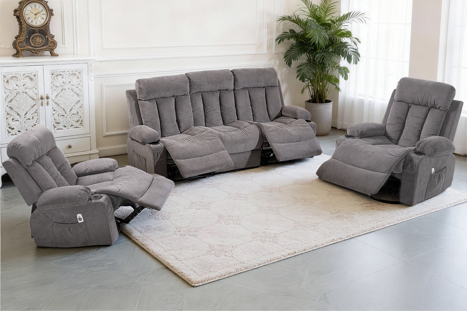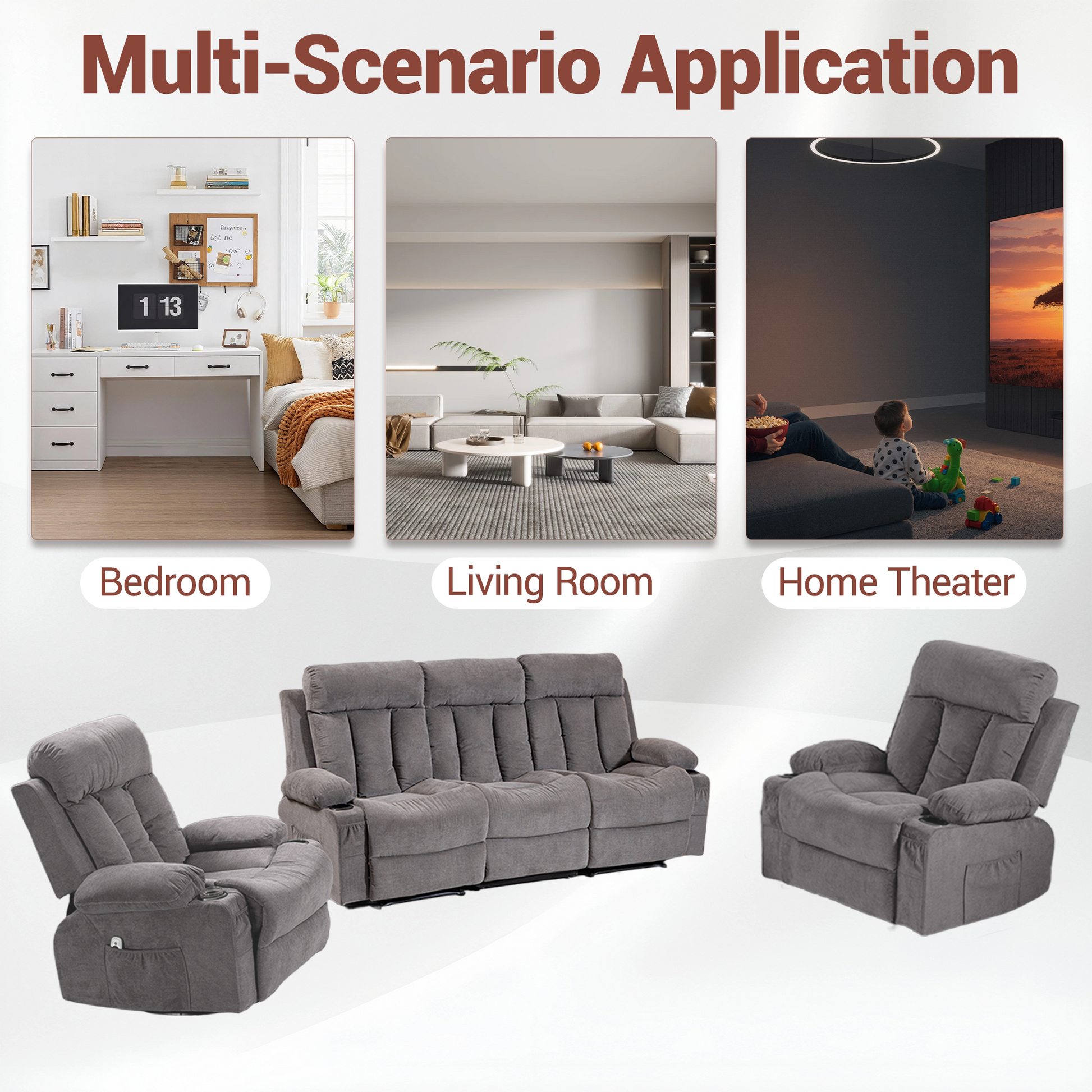 This 3 piece recliner sofa set includes a manual reclining sofa, and two swivel recliner chairs, creating a coordinated and versatile seating solution for modern living spaces. Designed for living rooms, home theaters, offices, RVs, and apartments, this reclining living room furniture set combines comfort, functionality, and clean modern style.