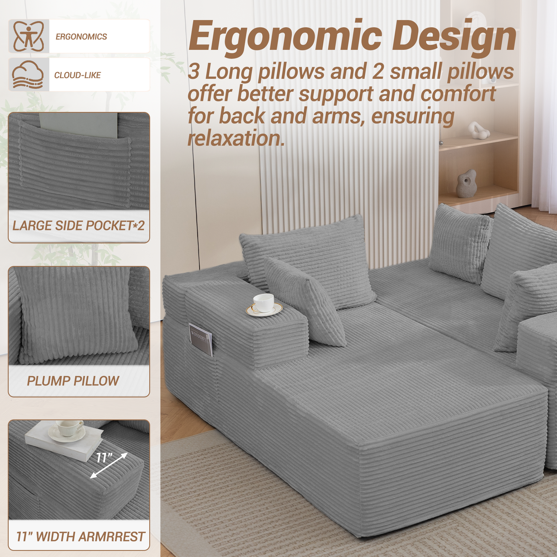 DELMANGO Modular Sectional Sofa with L-Shape Chaise, Corduroy Boneless Couch Set for Living Room, No Assembly Required, Grey